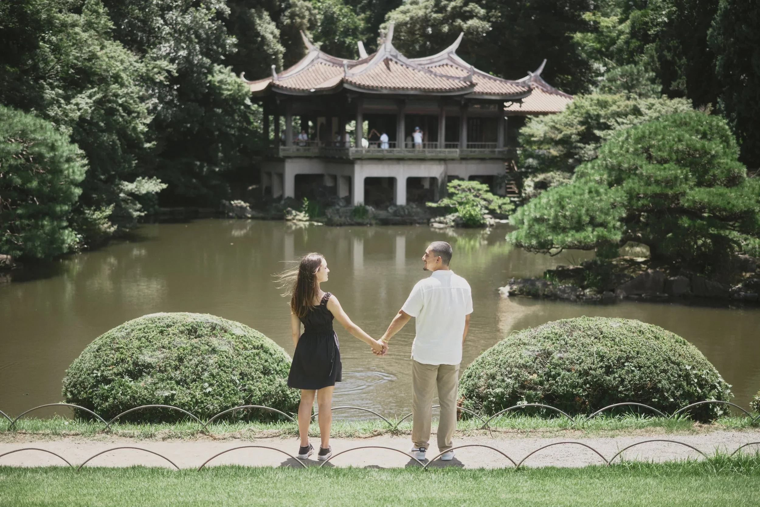 Located beside Tokyo Bay, Hamarikyu Gardens features seawater ponds that rise and fall with the tide, a unique feature among Tokyo parks. The teahouse on the island creates a beautiful backdrop for intimate, timeless photos.