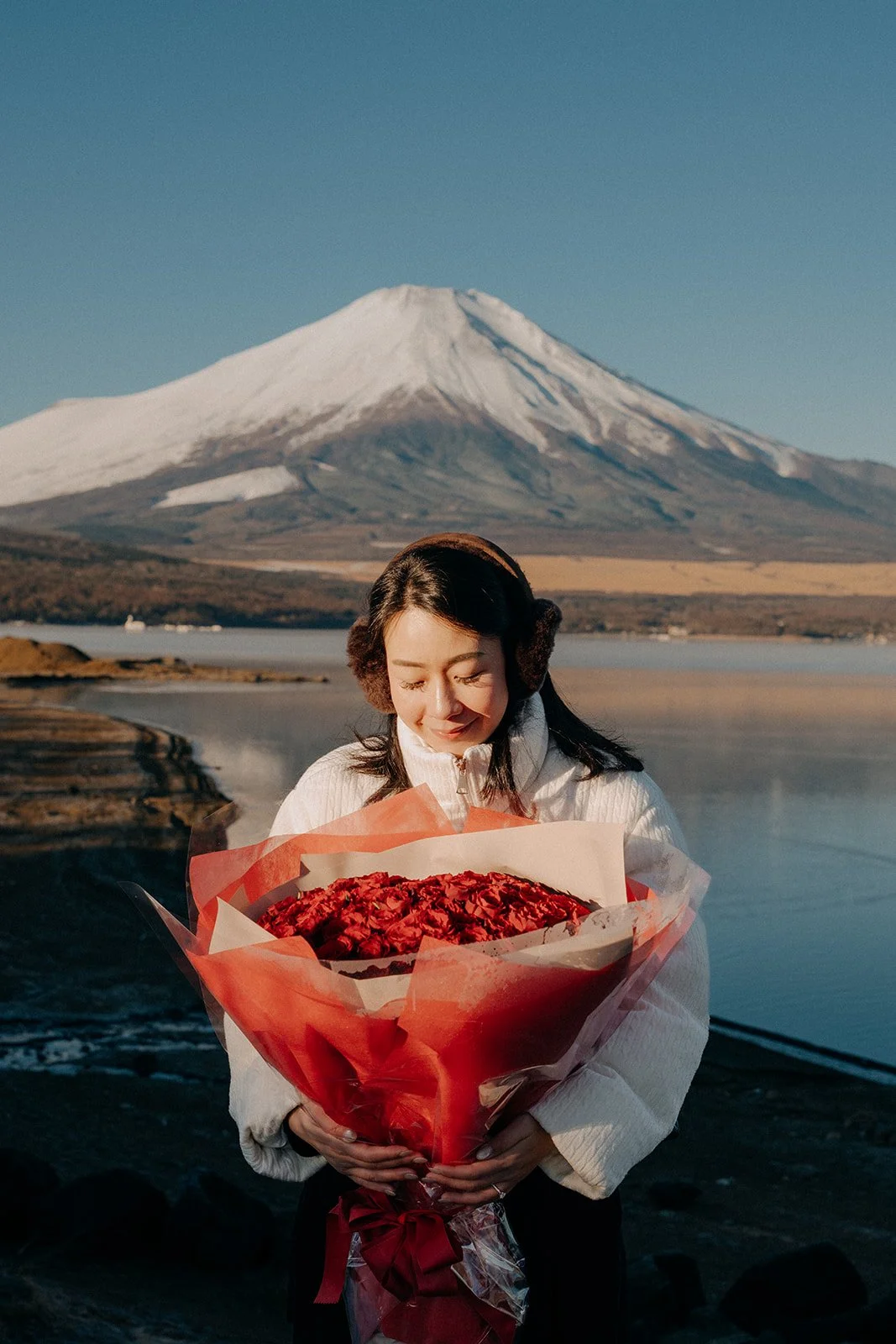 January in Japan can be extremely cold, and that morning dropped to -15°C, so we made sure to take short breaks to warm up. We were incredibly lucky to spot swans and witness a perfect reflection of Mount Fuji on the lake, which added an extra layer of romance to the shoot.