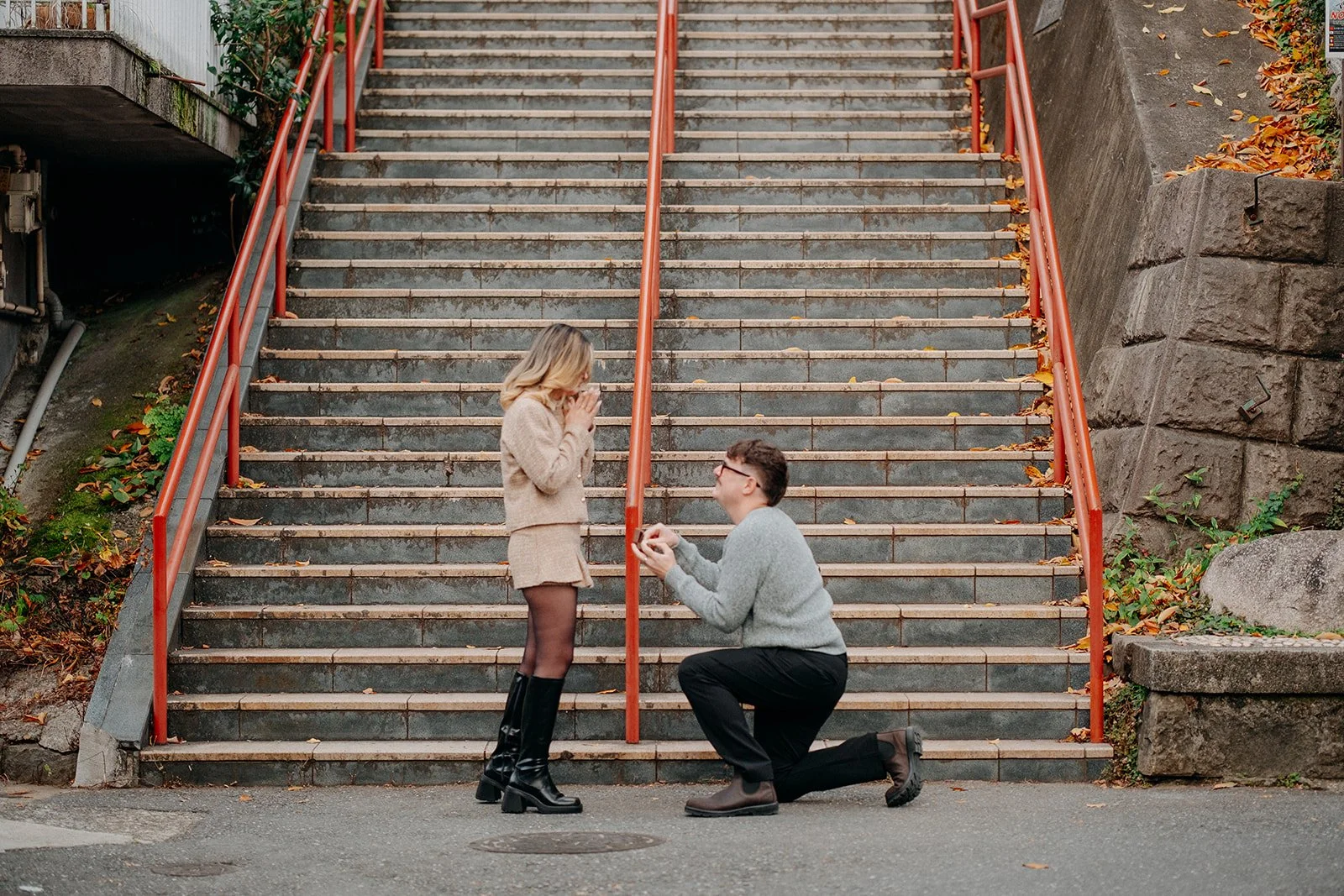 The stairs from Kimi No Na Wa were the obvious choice for the first location. Jasmine thought we were simply doing a regular photoshoot, so she was relaxed and enjoying the experience. With the iconic red railings behind them, Jonathon went down on one knee and asked Jasmine to marry him. In that moment, they became the main characters of the scene they had admired for so long. After the proposal, we continued capturing photos and even recreated a few of the famous shots from the movie.